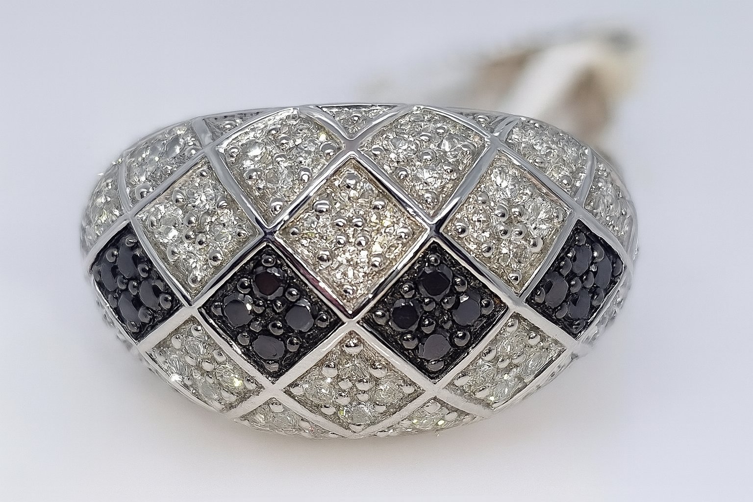 This exquisite 12mm dress ring crafted from 9ct white gold features a stunning pavé setting of round brilliant cut diamonds. Sixteen black diamonds totaling 0.18ct contrast beautifully with fifty-two white diamonds totaling 0.52ct, creating a sophisticated and elegant sparkle. Perfect for adding a refined touch to any ensemble.