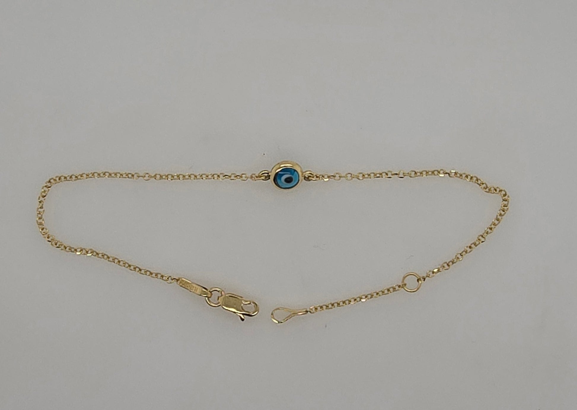 9CT YELLOW GOLD IMPORTED 5.5MM EVIL EYE 18-20CM BRACELET.