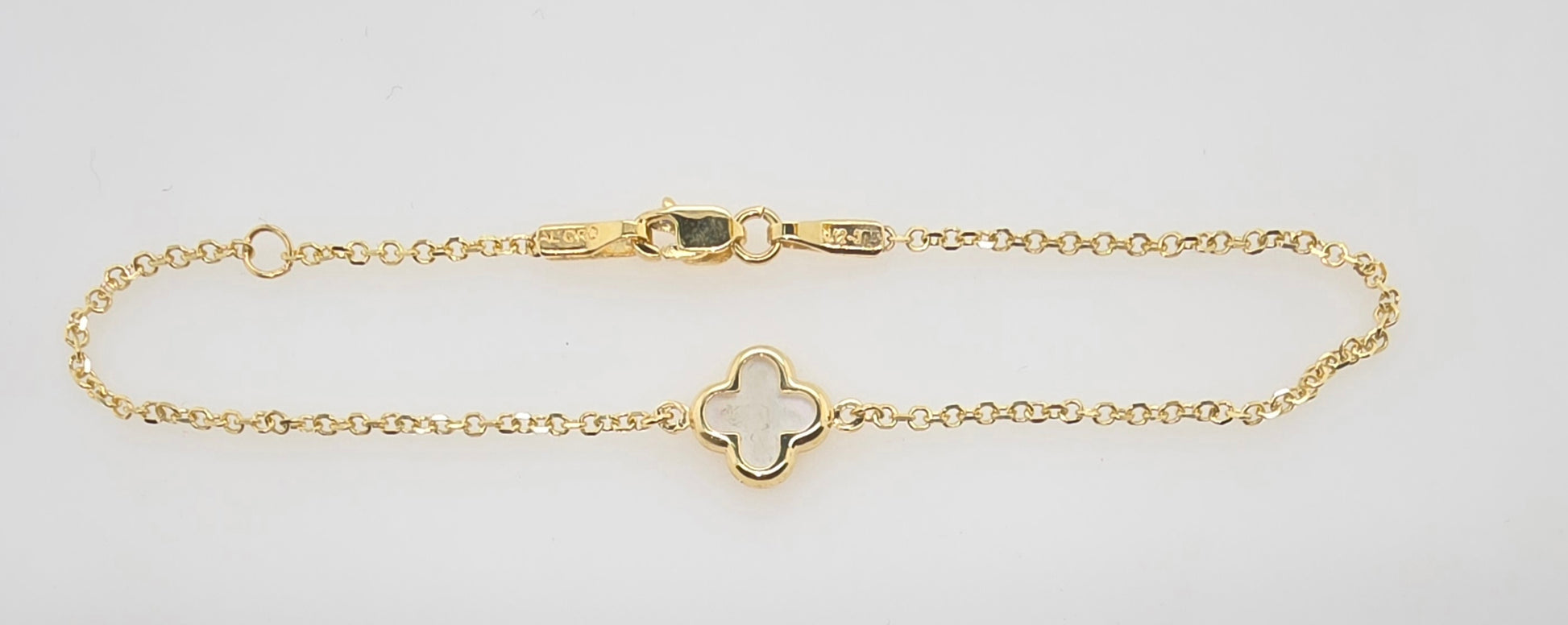 9CT YELLOW GOLD IMPORTED 9MM MOTHER OF PEARL CLOVER 16-18CM BRACELET.