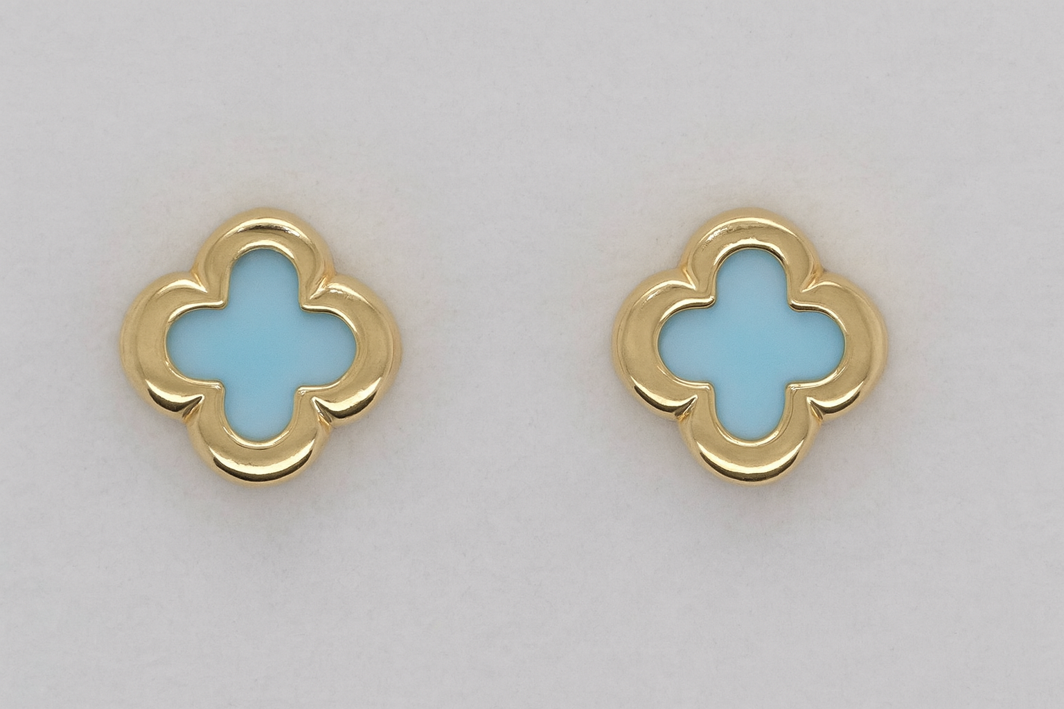 9CT YELLOW GOLD IMPORTED TURQUOISE 7.5MM CLOVER STUD EARRINGS.