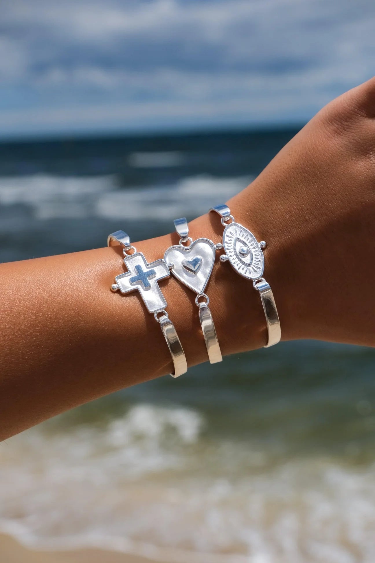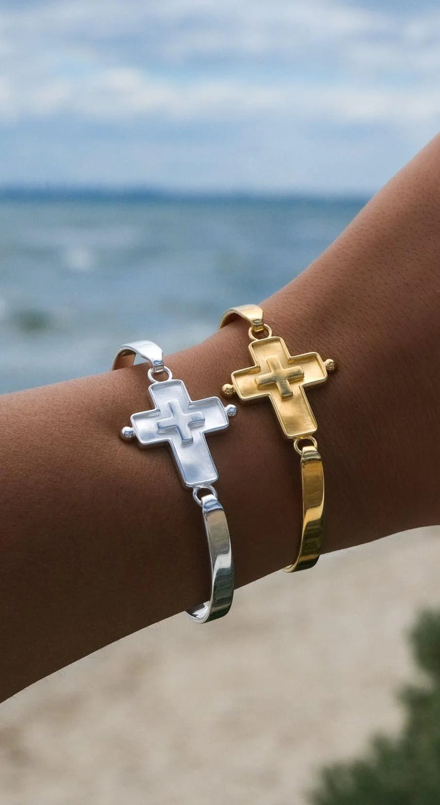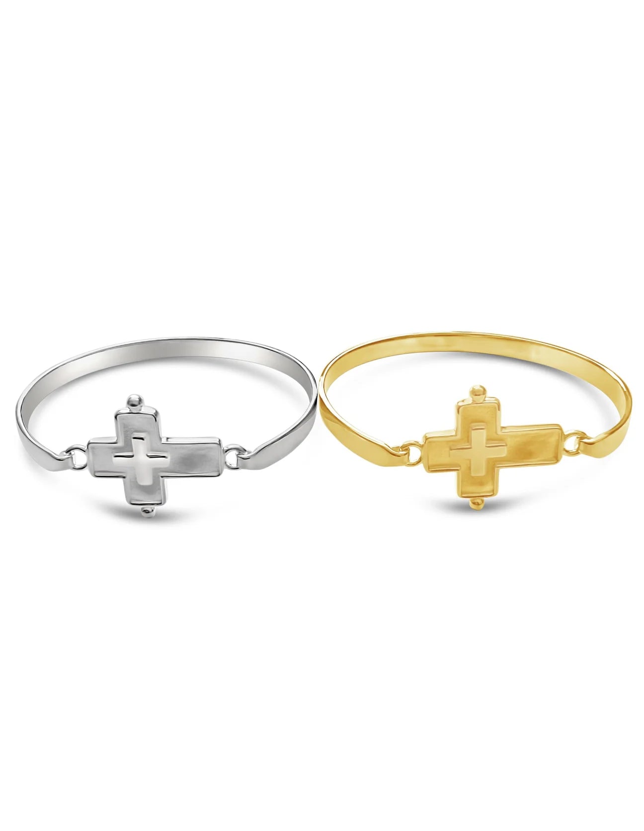 Elevate your style with the SUE SENSI COUNT THE STARS CROSS BANGLE. Crafted from luxurious sterling silver, this bangle features a stunning cross design that symbolizes hope and faith. Embody understated sophistication with this timeless piece that will add a touch of elegance to any outfit.